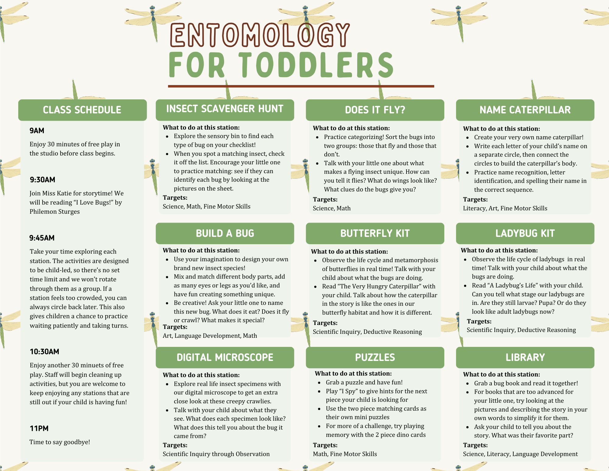 Join us for the launch of our Toddler-Ologies STEM series! This week, we’re exploring the amazing world of BUGS! Designed specifically for curious little learners, this hands-on class encourages observation, critical thinking, and scientific exploration, all through play! Together we’ll discover what makes insects so unique while nurturing your child’s natural curiosity and love of learning.